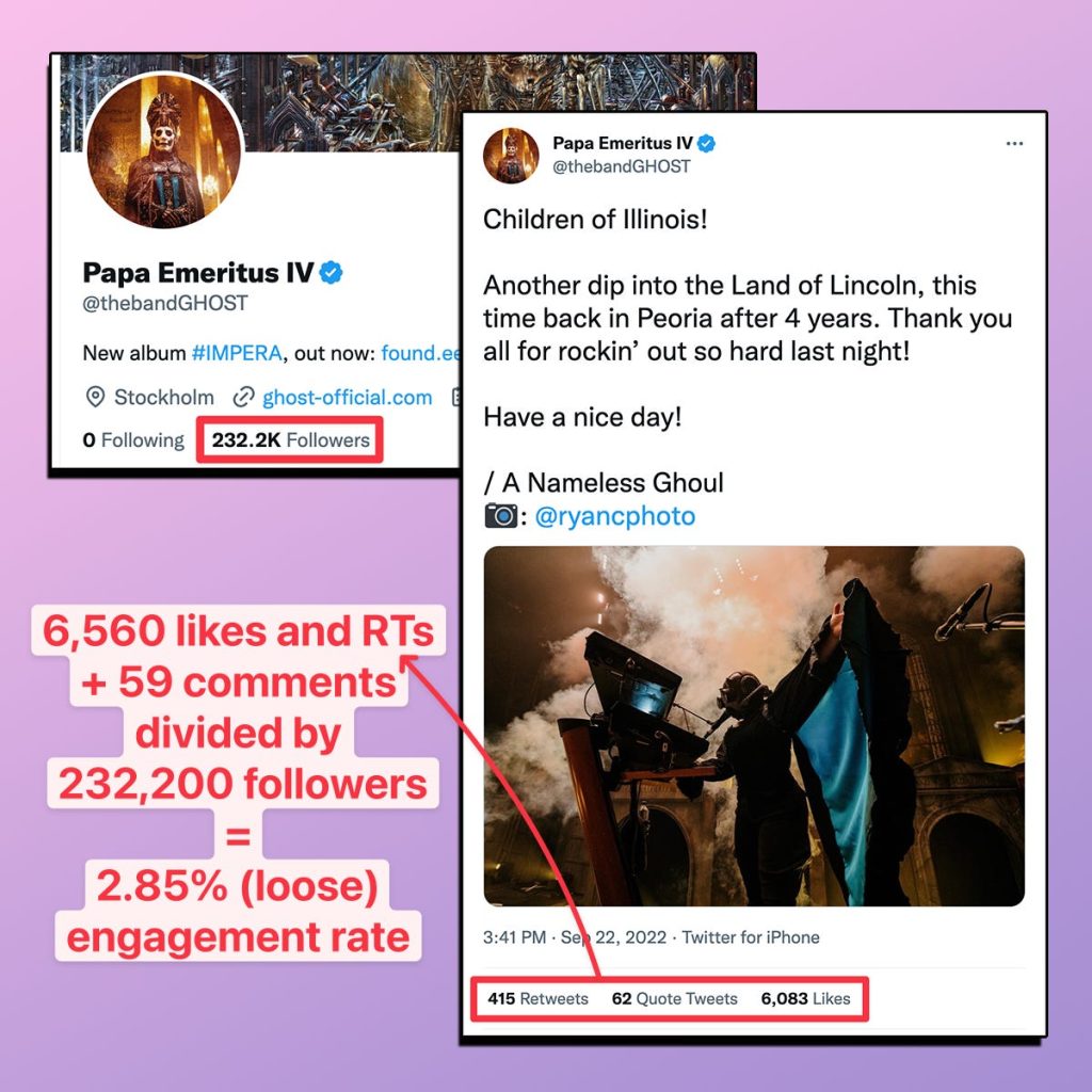 4. Figure out a loose engagement rate from your favorite bands / brands / shops / media outlets. Just take the number of LIKES and RTs, add in the comments, then divide all that by the number of followers they have. This won’t be 100% accurate, but it’s fun to see a ballpark number and compare it to your own efforts.