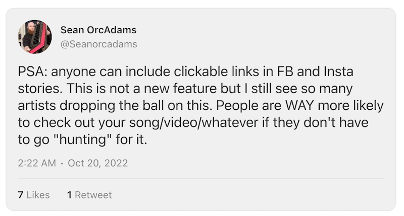 The above is mostly true (I think you need to post your story to FB from IG for this to work), but still – INCLUDE LINKS. Fuck the algorithms. If only 10 people see your post at least they’ll have a link to click!