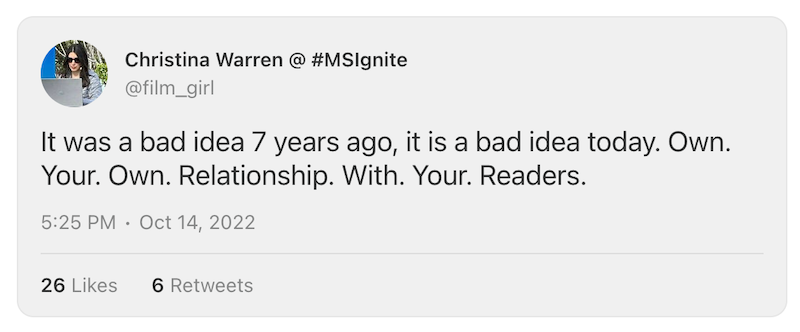 This from Christina Warren, regarding news sites forking their content over to places like Apple News, but this applies to your art and magic and the relationship you have with your fans! Hard to own the relationship with your fans when Apple / Amazon / YouTube / Twitch / Facebook have all the data!