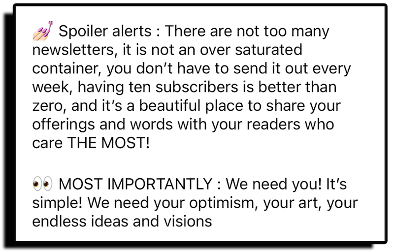 I help creative people quit social media, promote their work in sustainable ways, and rethink how a website and newsletter can work together. Find out more here. 🏳️🌈🏳️⚧️