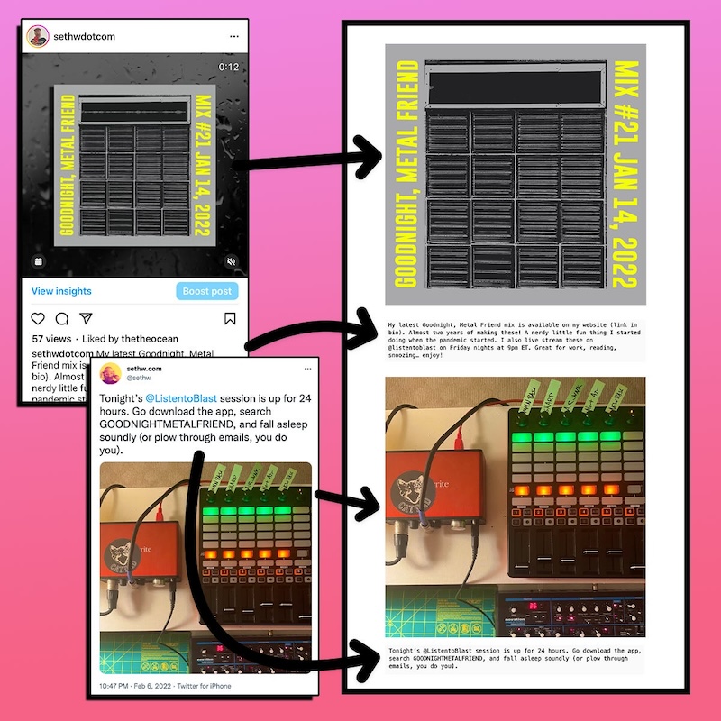 Using my Goodnight, Metal Friend dark ambient mix project as an example (hey, I do other stuff besides work), and you can see how I could re-use the images and text from my social media posts (Instagram and Twitter) and just copy & paste them into a newsletter format.