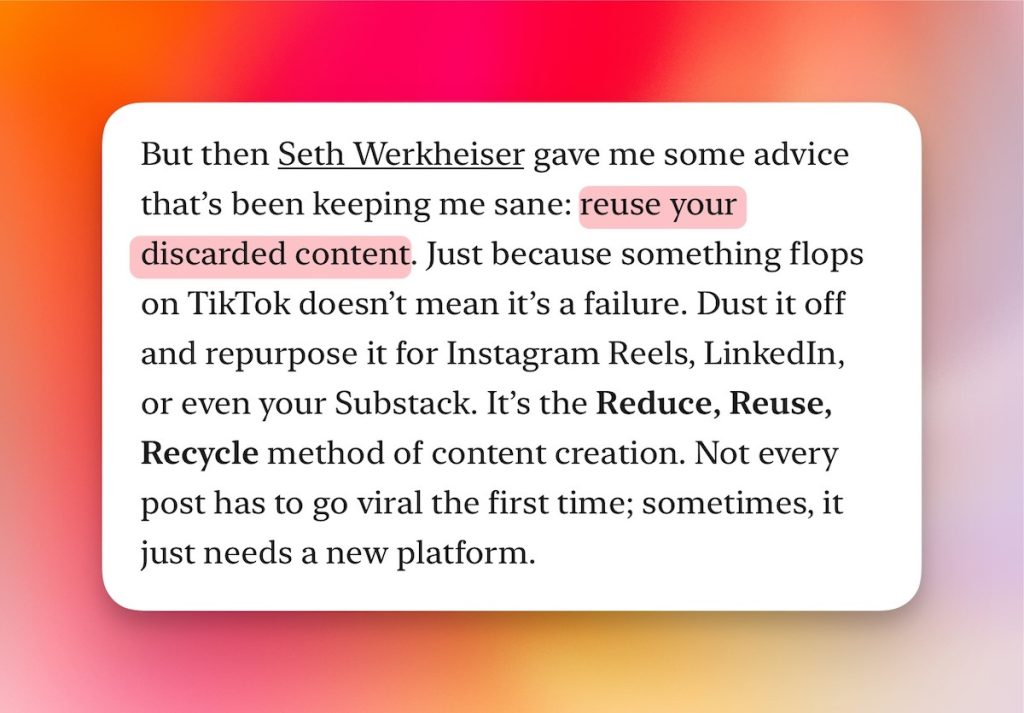 I recommend focusing on one or two places at most, intentionally driving the interest and clicks back to a place (Substack or your website) where people who want to become bigger fans of your work can subscribe to an email list.
