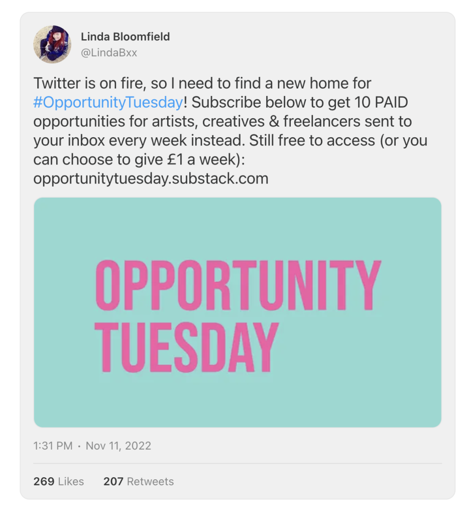 Much of that, though, is having built a reputation for something cool and useful (sending out job postings in the creative world every Tuesday), so when she says “hey, we’re moving to an email newsletter,” her already devoted fans followed her.
