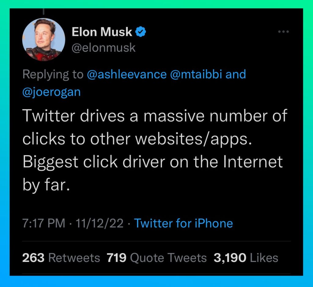 That from Matt Taibbi on Twitter, which spark Musky-boys reply that Twitter is “the biggest click driver on the internet by far.”