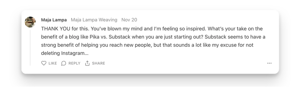 I got a great question from Maja Lampa asking about using a stand-alone blogging platform like Pika versus using Substack.