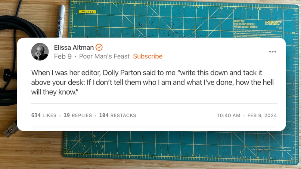 Tell people about your work in only the way that you can, because if an unpaid intern (or an AI prompt) could write your self-promo copy, you’re toast.