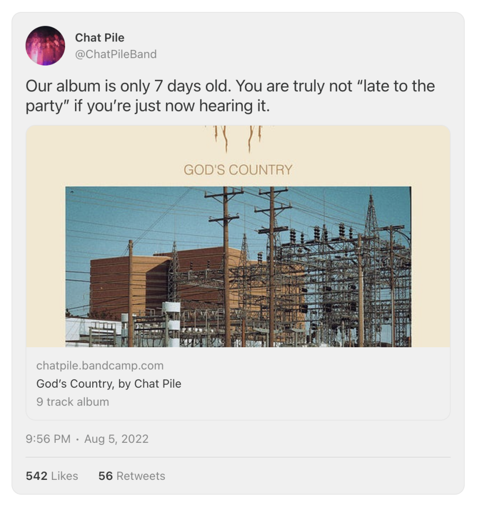 Hey wait a minute – aren’t bands supposed to just Tweet about their new release once and then disappear into a boggy swamp?! It takes a minute to hype your release a week later, a month later, six months out. Same for your music videos, press hits, and tour dates.