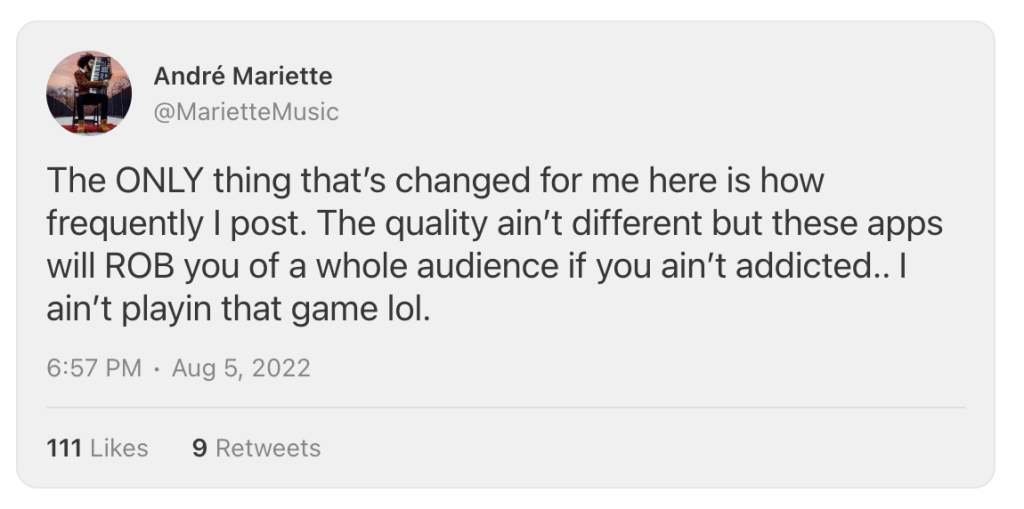 I’ve seen music reaction streamers on YouTube gripe about this – that if they don’t post stuff every day, the algorithm throttles their channel and less people see their videos.