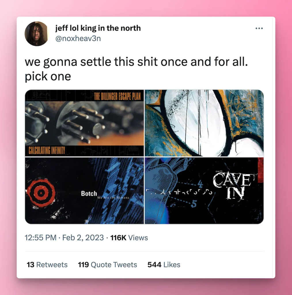 - Make your own “pick one” images (like this one), and put it on your website. Have your band mates chime in and make it a whole feature – hey, it’s what all the music sites do, and people click on ‘em! Get ‘em clicking to your site instead and sell some albums.