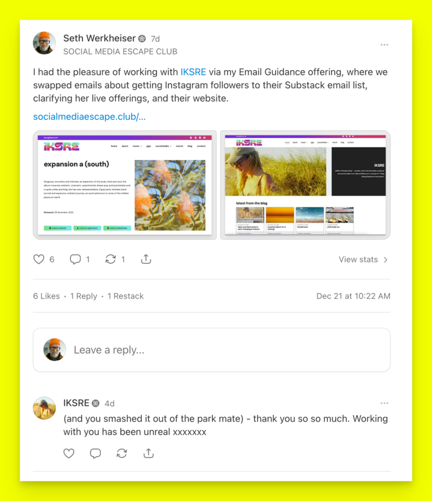 Seth’s email guidance was such a breath of fresh air. Even before I reached out, I had a feeling this would be different—and wow, that was an understatement. Seth’s personality shines through every email. The energy, enthusiasm, and thoughtful care in every sentence feel truly genuine—which, sadly, is rare these days. I was blown away that the insight and attention poured into that very first email came at no cost. Seth brings a fresh, unmatched perspective that’s absolutely invaluable. His guidance opened me up to trying something completely new—something I wouldn’t have considered otherwise—and for that, I’m incredibly grateful. KELSEY CHRISTINE of LAUNCH YOUR DAYDREAM